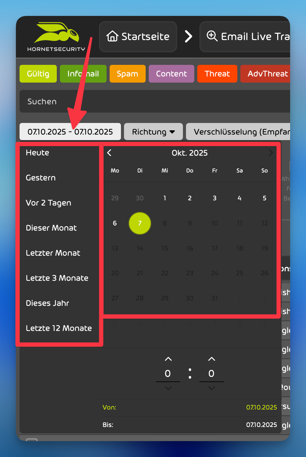 Nach dem öffnen des Trackings, siehst du deine Mails vom heutigen Tag. Du kannst den Tag über das Auswahlmenü verändern und speziell einen Tag oder einen Zeitraum auswählen.
